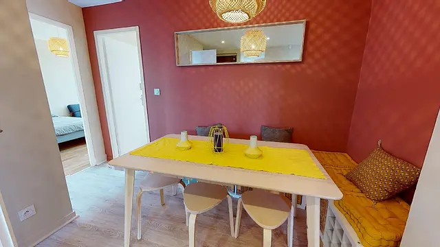 L'entrée de l'appartement s'ouvre sur une pièce de vie avec table à manger, et fauteuil.