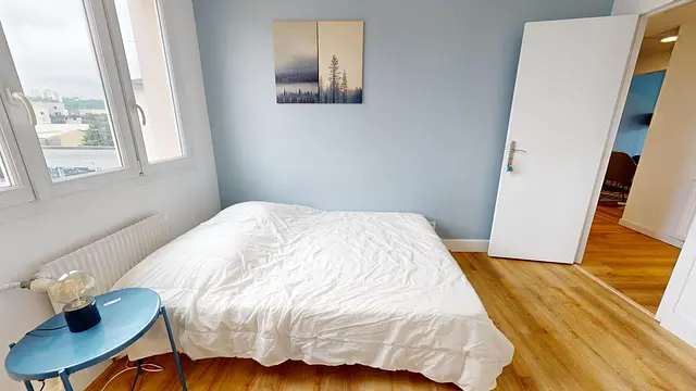 Cette chambre est entièrement meublée, avec un lit double, un bureau, une armoire miroir et du linge de lit neuf. Cette chambre est particulièrement lumineuse grâce à une grande fenêtre.