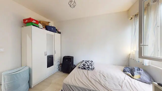 La chambre est meublée avec lit double, placard de rangement ainsi qu'un bureau.