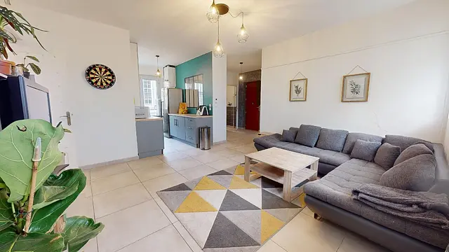 Cette colocation de trois chambres s'ouvre sur une grande pièce de vie aménagée d'un grand canapé, deux tables basses, un meuble TV avec une télévision ainsi qu'une table avec une chaise.