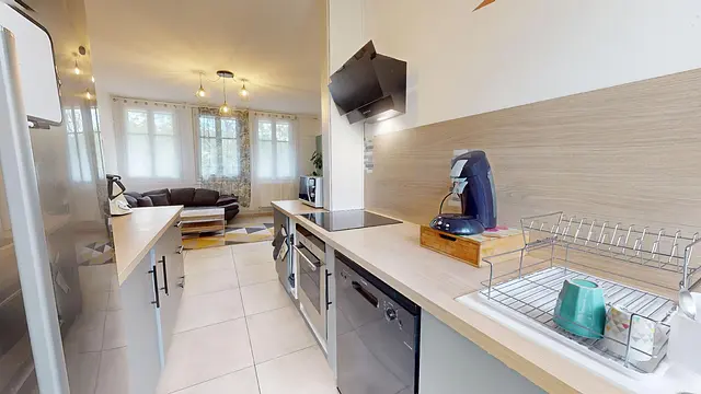 Le coin cuisine est équipé d'un micro-ondes, un four, des plaques de cuisson avec une hotte, une machine à café, un évier avec un égouttoir, un lave-vaisselle, un réfrigérateur, un congélateur, un mixeur ainsi que de nombreux rangements.