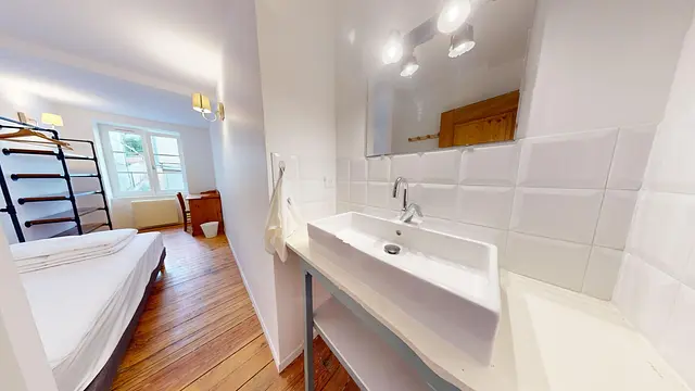 Cette chambre est équipée d'un évier, d'un lit, d'un bureau et de rangements.