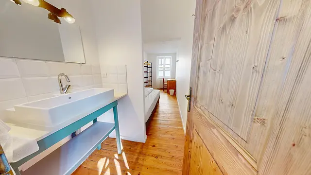 Cette chambre est équipée d'un évier, d'un lit, d'un bureau et de rangements.
