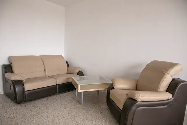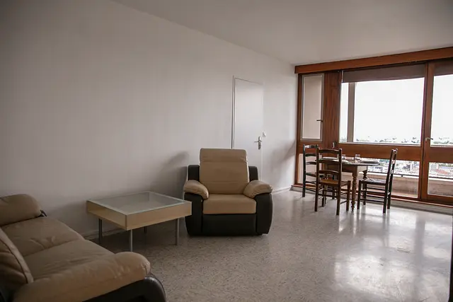 Le salon est très lumineux, il dispose d'un canapé avec un fauteuil, une table avec quatre chaises, idéal pour partager des repas entre colocataires. Cette pièce a un accès direct sur un balcon partagé avec la cuisine. Cette dernière est équipée d'un réfrigérateur avec congélateur, un four, des plaques à induction avec une hotte, une bouilloire, un évier, une poubelle et de nombreux rangements.