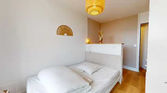 Cette chambre est lumineuse grâce à sa grande fenêtre orientée sud-est, elle dispose d'un lit double, d'une table de chevet, d'un bureau et de nombreux rangements.
