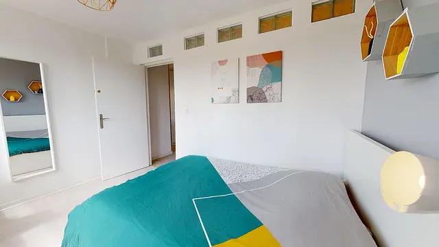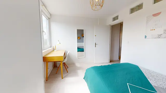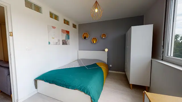 Avec son parquet en bois clair, sa vue dégagée sur les monts du Lyonnais, la chambre 4 de cette colocation est particulièrement lumineuse. Avec son bureau stylé, son lit double avec tête de lit, son placard, les éléments de déco et le luminaire, c’est une pièce parfaitement meublée et idéalement agencée pour profiter de la jolie vue.