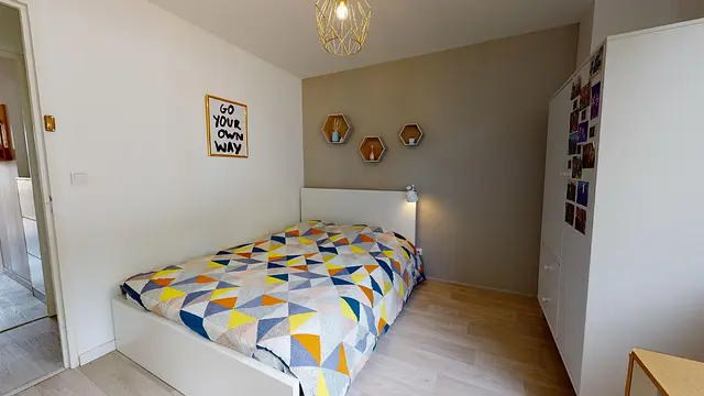 A l’instar des autres chambres, la deuxième de la coloc possède une vue sans vis-à-vis, un parquet en bois clair qui la rend lumineuse et un mobilier complet : lit double, bureau (attenant à la fenêtre, idéal), et grand placard. La literie est fournie. Que demander de mieux ?