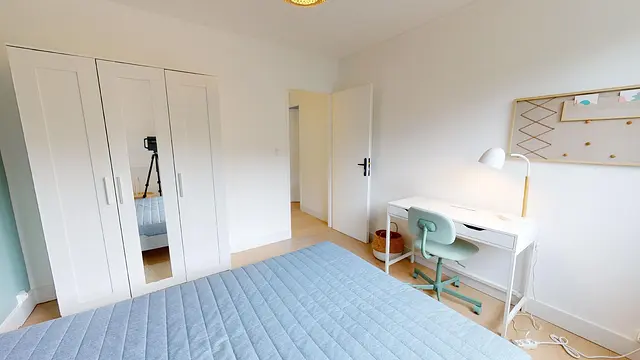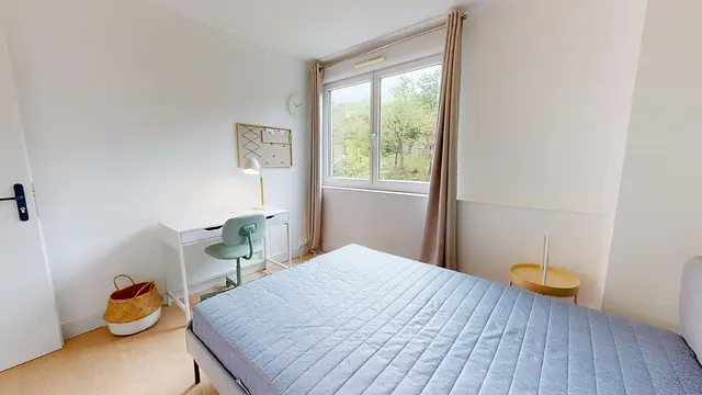 Cette chambre dispose d'un lit double, un bureau avec lampe et chaise, une table de chevet et une armoire avec miroir plein pied.