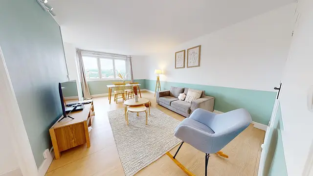 Le salon, très lumineux, est aménagé d'une table avec quatre chaises, idéal pour partager des repas entre colocataires, un canapé, deux tables basses, un fauteuil, un meuble TV avec télévision et plusieurs éléments de décoration ainsi qu'un placard mural.