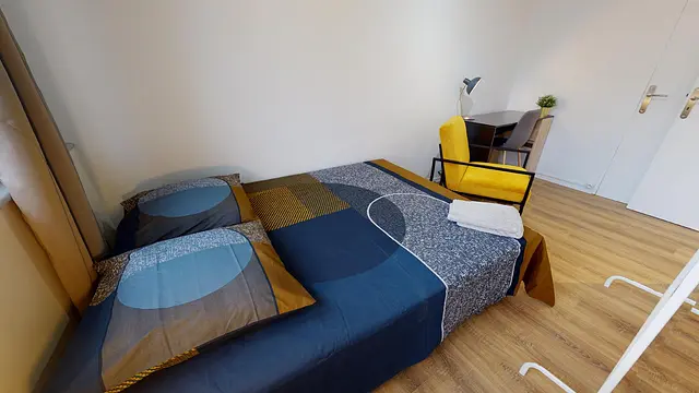 L’aménagement des 9,5 m2 de la chambre 4 offre tout le confort nécessaire : un lit double, un bureau, une chaise et un placard de rangements.
