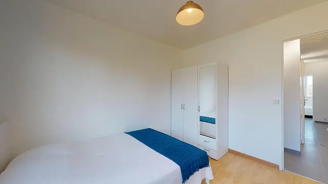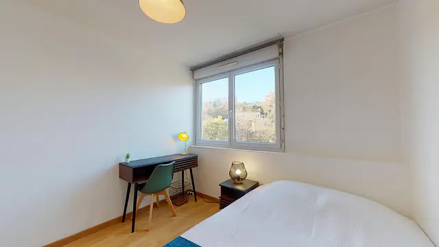 La chambre 3 profite comme les autres chambres de ce côté de l'appartement d’une vue agréable sur les espaces verts environnants la résidence. Elle ne donne pas sur la rue et profite donc du calme. Elle est bien et joliment meublée : lit double, table de nuit, grand placard et bureau. Top confort.