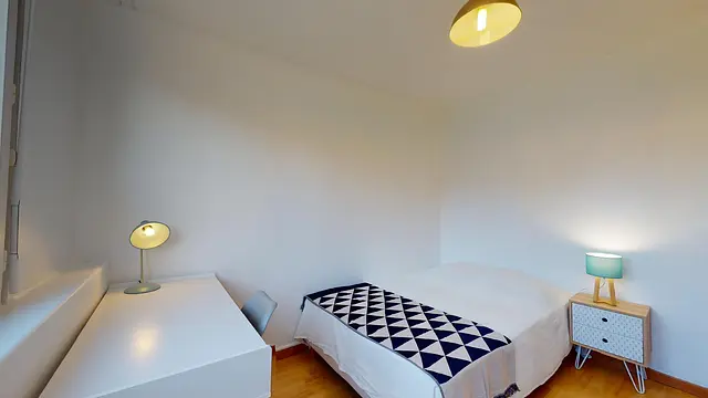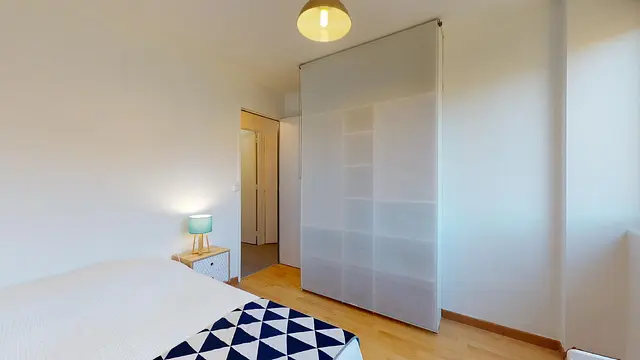 La chambre 4 profite comme les autres chambres de ce côté de l'appartement d’une vue agréable sur les espaces verts environnants la résidence. Elle ne donne pas sur la rue et profite donc du calme. Elle est bien et joliment meublée : lit double, table de nuit, grand placard et bureau. Top confort.