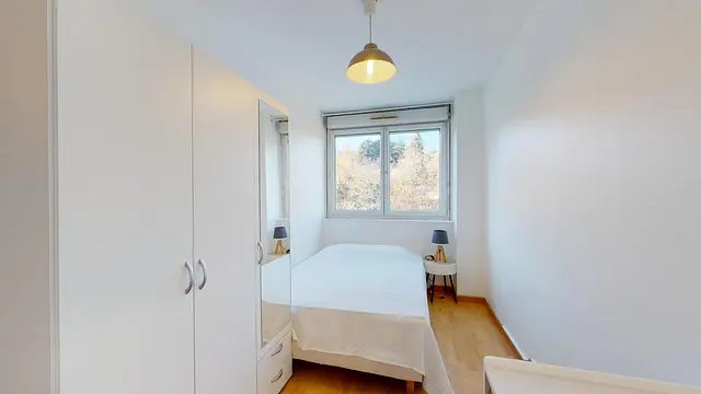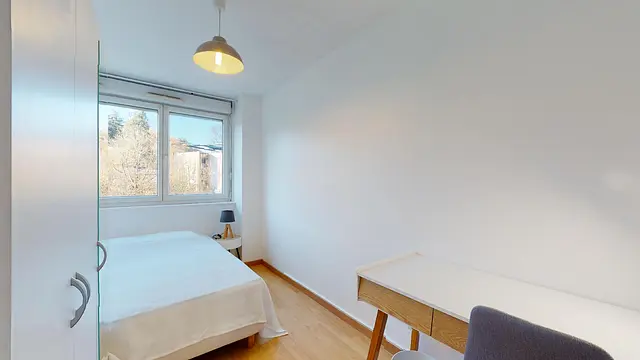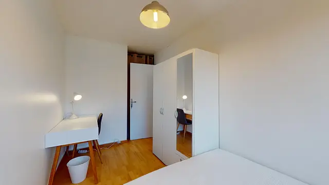 La chambre 5, tout au bout du couloir, profite comme les autres chambres de ce côté de l'appartement d’une vue agréable sur les espaces verts environnants la résidence. Elle ne donne pas sur la rue et profite donc du calme. Elle est bien et joliment meublée : lit double, table de nuit, grand placard et bureau. Top confort.
