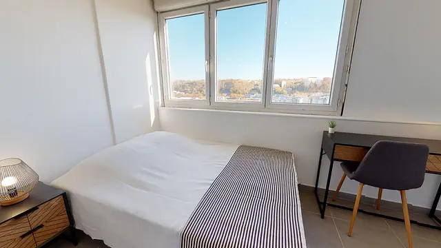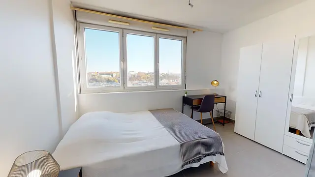 La chambre 1, accessible depuis le salon, dispose de THE vue sur Lyon 9. Naturellement, elle n'a aucun vis-à-vis et est donc particulièrement lumineuse. Elle est en outre bien meublée et dispose d'un lit double, d'un grand placard, d'une table de nuit avec lampe de chevet et d'un bureau.