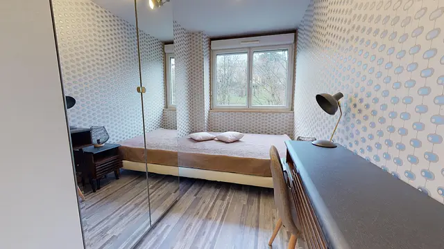 La chambre 1, la première au fond du couloir bénéficie de toilettes privées ainsi qu'un lavabo. Aménagée en longueur, elle dispose d'un lit, d'un grand placard avec portes-miroir, un bureau, une table de nuit avec lampe de chevet. Elle donne sur l'arrière de la résidence, boisée.