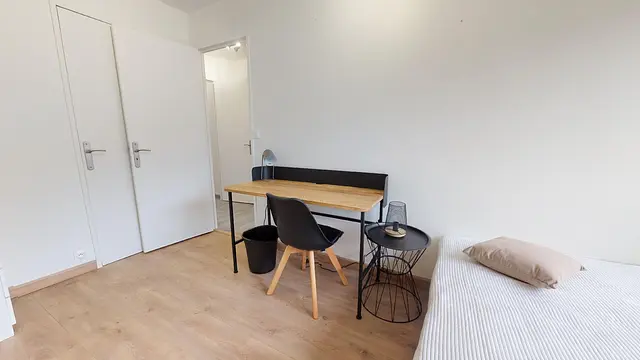 Dernière chambre à profiter de la vue sur l'arrière de la résidence, la chambre 4 dispose d'un lit double, du combo table de nuit lampe de chevet, d'un bureau, d'une colonne avec tiroirs et d'une double penderie.