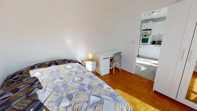 La chambre 2, adjacente au salon, est très lumineuse grâce à sa double baie vitrée s’ouvrant sur le balcon. Elle se compose d’un lit double, d’une penderie et d’un bureau.