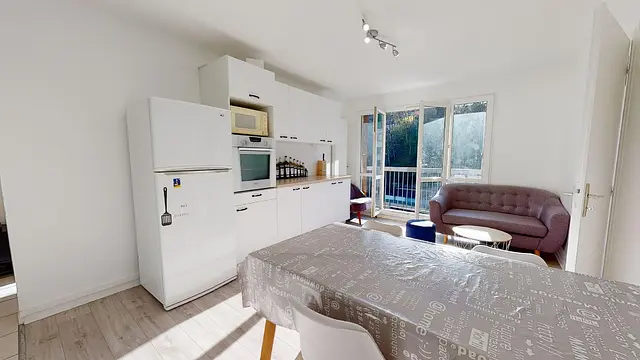 L’appartement se compose d’une grande pièce de vie de 20 m2 composé d’un espace salon avec canapé, table basse et table à manger et d’un espace cuisine moderne et totalement équipée : machine à laver, lave-vaisselle, four, micro-onde, frigo, machine à café, plaques et hotte.