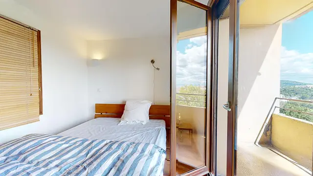 Cette Chambre se compose d'un lit double, d'un bureau accompagné d'une chaise et d'une lampe et d'une table de chevet avec sa lampe, d'une armoire et d'un meuble étagère . Cette chambre a un accès direct à un agréable balcon avec vue d’exception sur Lyon et région.