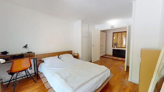 Cette Chambre se compose d'un lit double, d'un bureau accompagné d'une chaise et d'une lampe et d'une table de chevet avec sa lampe, d'un placard de rangement. Cette chambre à accès à une agréable loggia privative.
