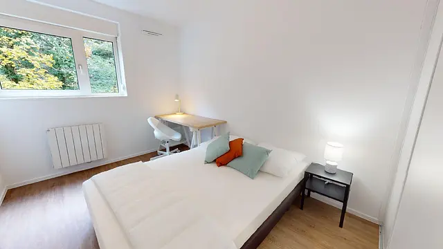 Cette chambre dispose d'un lit double, une table de chevet avec une lampe, un bureau avec une lampe et une chaise ainsi qu'un placard mural.