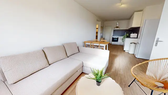 Le séjour est aménagé d'un canapé, une table basse, un fauteuil ainsi qu'une table ainsi que quatre chaises, idéal pour partager des repas entre colocataires.