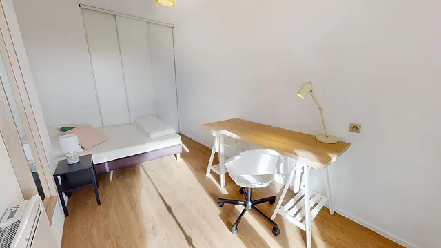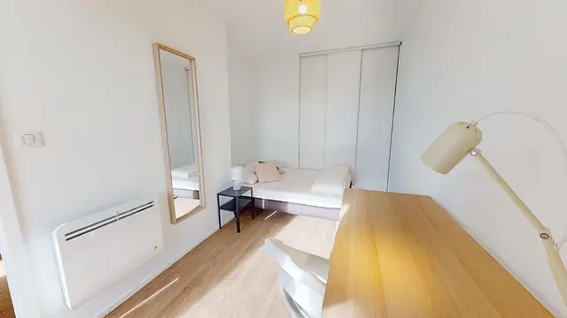 Cette chambre dispose d'un lit double, une table de chevet avec une lampe, un bureau avec une lampe et une chaise ainsi qu'un placard mural. Le plus : Cette chambre a d'un accès direct sur le balcon !