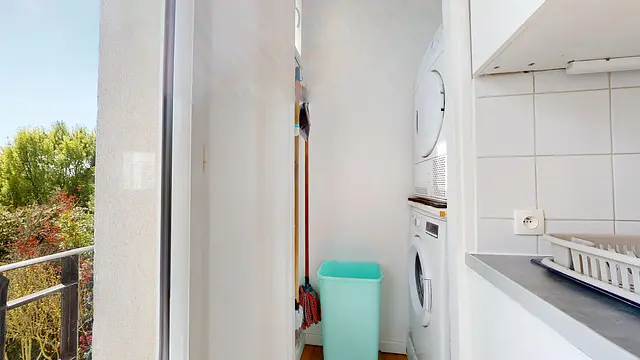La cuisine se compose de deux grands frigidaires, un four, une hotte, 4 plaques de cuisson au gaz, un micro-onde ainsi que de nombreux placards de rangement. Accolée à la cuisine, une buanderie vous permettra de réaliser vos lessives.