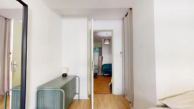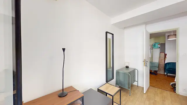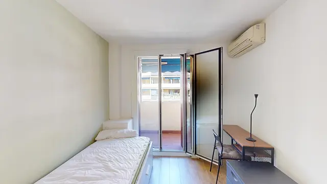 La chambre est équipée d'un bureau avec sa chaise, d'un lit simple, d'un miroir, d'une penderie et de nombreux rangements. Cette chambre est particulièrement lumineuse grâce à une porte-fenêtre qui donne sur le balcon.