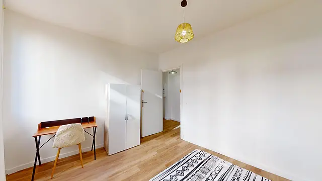 Cette chambre possède un lit double, bureau, et placard de rangement