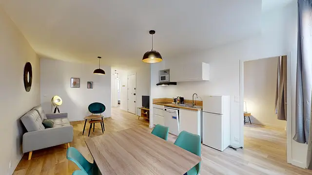 La colocation possède une belle pièce de vie avec cuisine ouverte sur séjour. L'espace salon est meublé avec canapé, table basse gigogne, TV et meuble TV, table à manger.