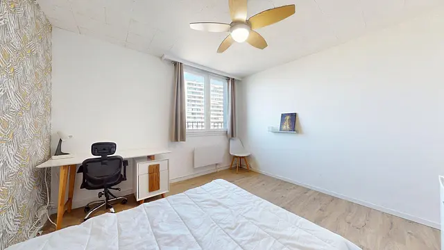 La chambre est entièrement équipée avec un lit clic-clac, un ventilateur de plafond, un bureau fonctionnel ainsi qu’un placard de rangement.