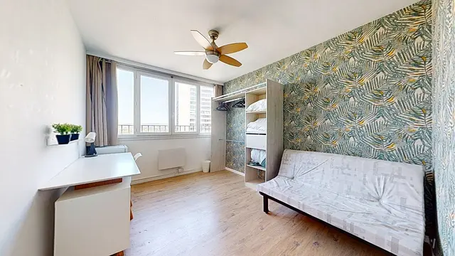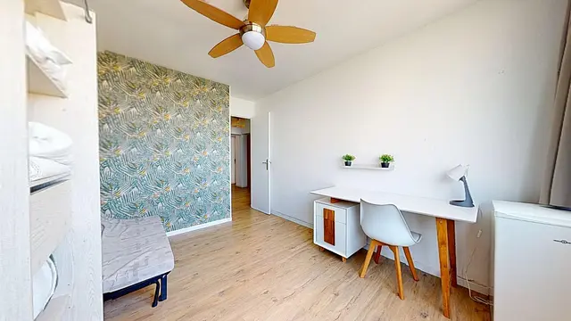 La chambre est entièrement équipée avec un lit clic-clac, un ventilateur de plafond, un bureau fonctionnel ainsi qu’un placard de rangement.