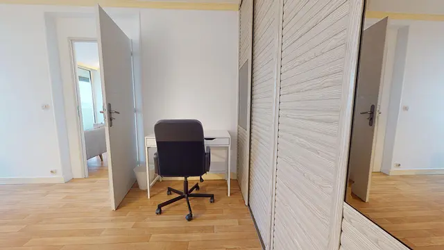 Cette chambre est meublée d'un lit double, d'un bureau simple et d'un grand placard de rangement encastré. Elle dispose également de son propre balcon privatif avec une belle vue dégagée sur Massy.