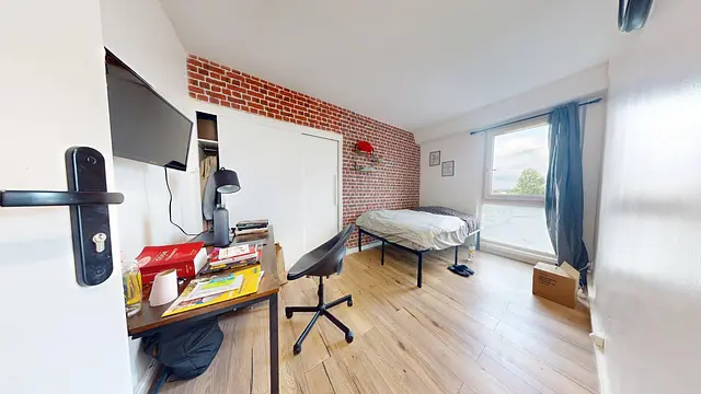 Elle est équipée d'un lit, bureau, télévision et placard de rangement.