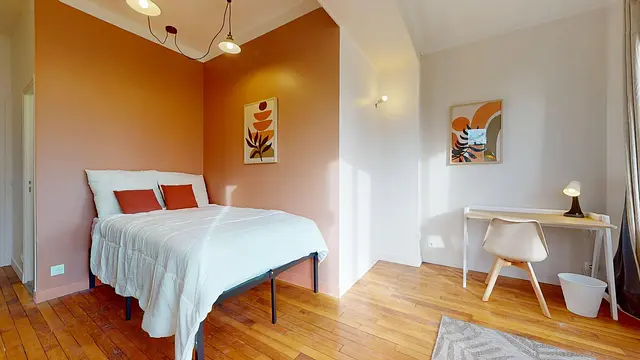 La grande chambre située au rez-de-chaussée est pensée pour un usage individuel confortable. Elle dispose d’un espace nuit agréable, d’un bureau et de rangements. La salle d’eau privative attenante comprend une douche, un meuble vasque et des sanitaires, offrant une vraie indépendance au sein de la colocation.