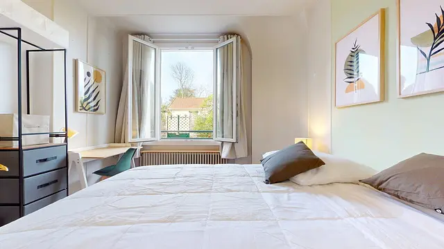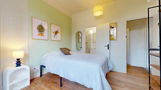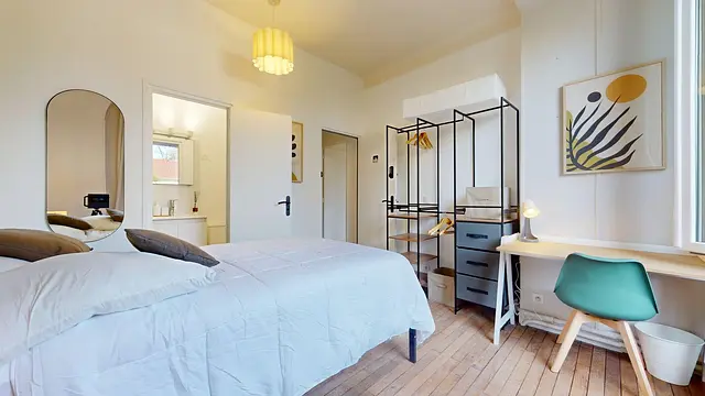 La chambre située au rez-de-chaussée est pensée pour un usage individuel confortable. Elle dispose d’un espace nuit agréable, d’un bureau et de rangements. La salle d’eau privative attenante comprend une douche, un meuble vasque et des sanitaires, offrant une vraie indépendance au sein de la colocation.
