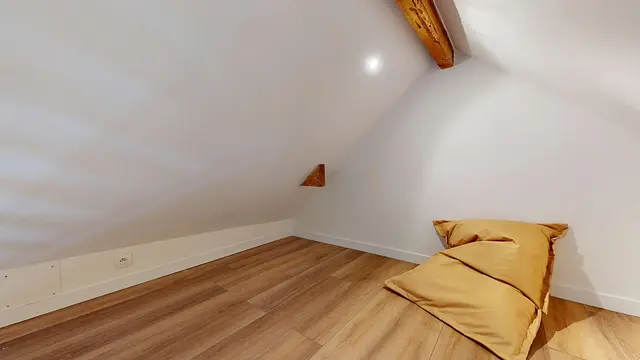 Cette chambre située sous les toits au 2ème étage offre un espace nuit confortable, un bureau et des rangements. Elle bénéficie d’une belle luminosité et d’un agencement fonctionnel. La salle de bain est partagée avec d’autres chambres de l’étage et est répartie de manière pratique pour un usage quotidien. La salle d’eau privative attenante comprend une douche, un meuble vasque et des sanitaires, offrant une vraie indépendance au sein de la colocation.
