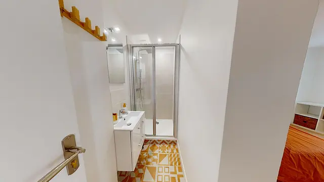 Une salle d'eau avec douche, deux miroirs et deux meubles vasques sont disponibles dans les espaces communs.