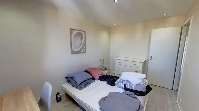Cette colocation de trois chambres s'ouvre sur une pièce de vie aménagée d'un canapé, d'un fauteuil, de tables basses, d'un meuble TV avec une télévision ainsi que d'une table avec quatre chaises, idéal pour partager des repas entre colocataires.