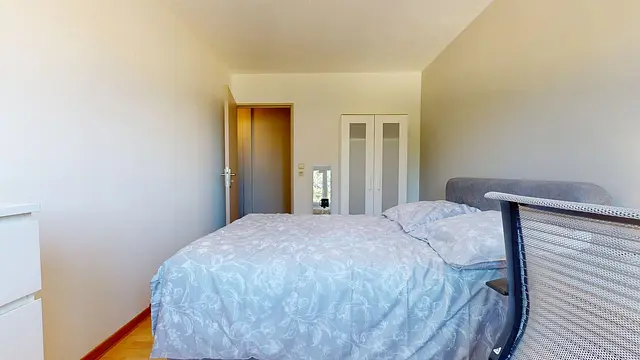 Elle est équipée d'un lit double, bureau, placard de rangement, commode de rangement ainsi qu'un miroir de plein pied.