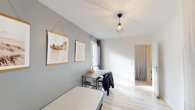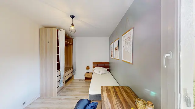 Oqoro vous propose cette chambre. Elle est composée d'un lit simple, d'un bureau avec une chaise et d'une table de chevet. Également, vous disposez d'un placard.