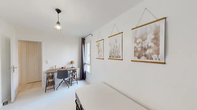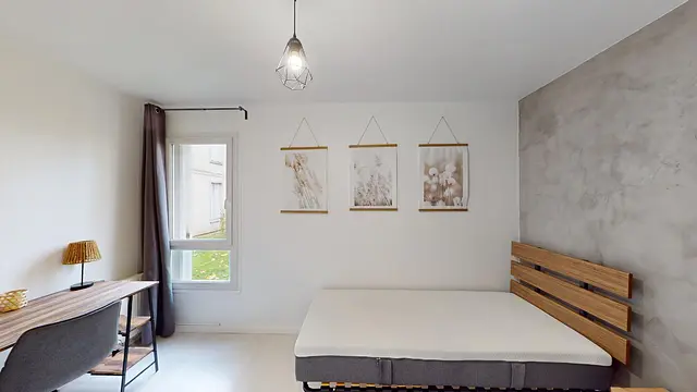 Oqoro vous propose cette chambre. Elle est composée d'un lit simpleu, d'un bureau avec une chaise et d'une table de chevet. Également, vous disposez d'un placard.