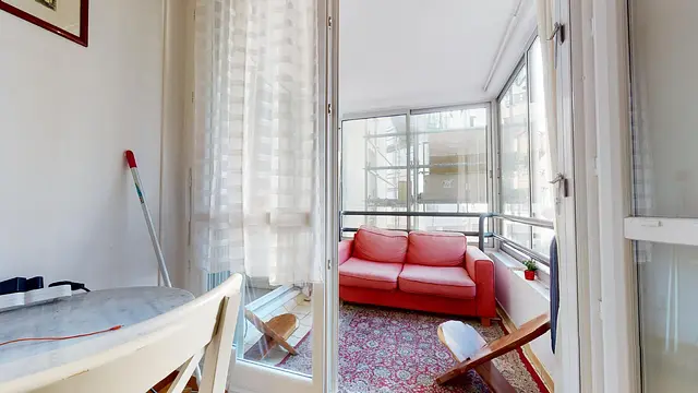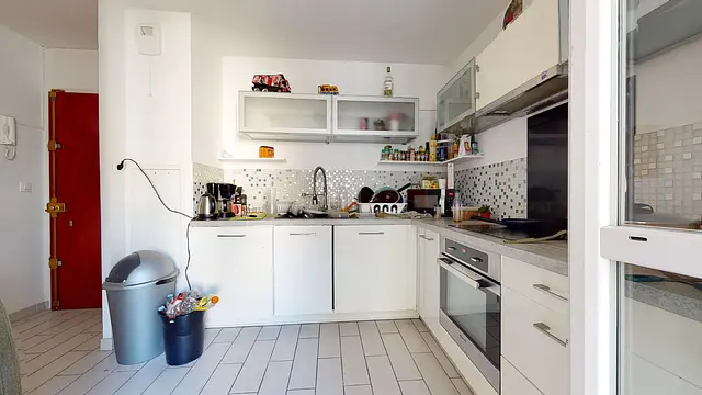 Cet appartement comprend un salon avec un canapé, une TV, une table et des chaises. Ce salon offre également l'accès à une loggia avec un canapé.La cuisine quant à elle est séparée et équipée avec un four, des plaques de cuisson, une hotte, un frigo, une table, des rangements, etc.Une salle de bain avec baignoire et meuble vasque ainsi que des WC séparés viennent compléter ce logement.Cet appartement est idéal pour la vie en colocation !
