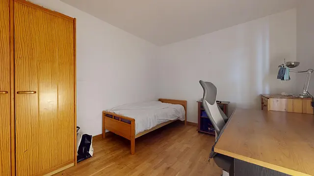 La chambre 1 est aménagée avec un lit double, un bureau, une chaise et des rangements.