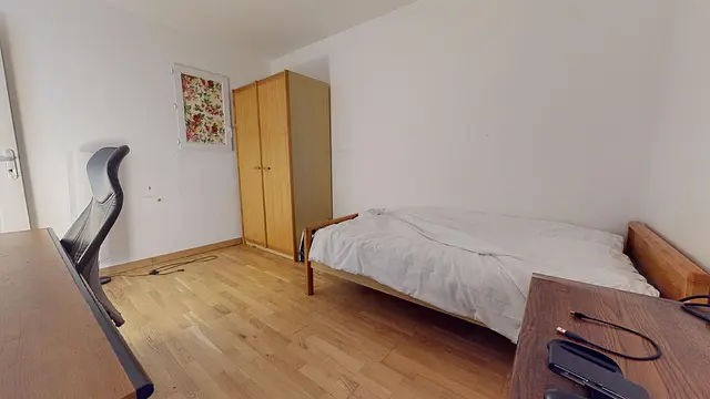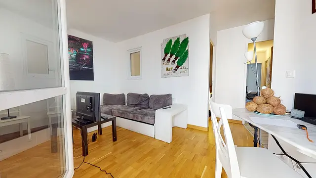 Cet appartement comprend un salon avec un canapé, une TV, une table et des chaises. Ce salon offre également l'accès à une loggia avec un canapé.La cuisine quant à elle est séparée et équipée avec un four, des plaques de cuisson, une hotte, un frigo, une table, des rangements, etc.Une salle de bain avec baignoire et meuble vasque ainsi que des WC séparés viennent compléter ce logement.Cet appartement est idéal pour la vie en colocation !