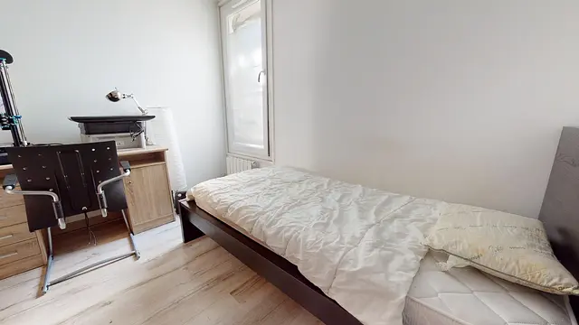 La chambre 3 est équipée avec un lit double, un bureau, une chaise et des rangements.