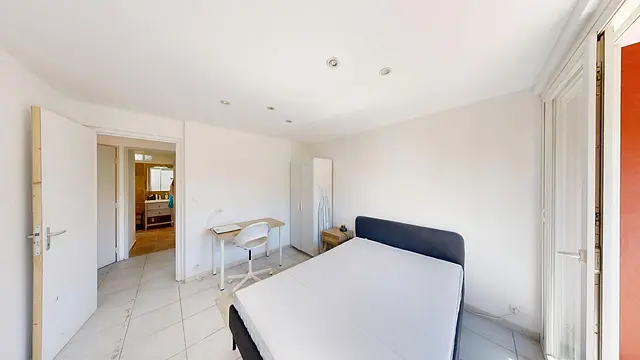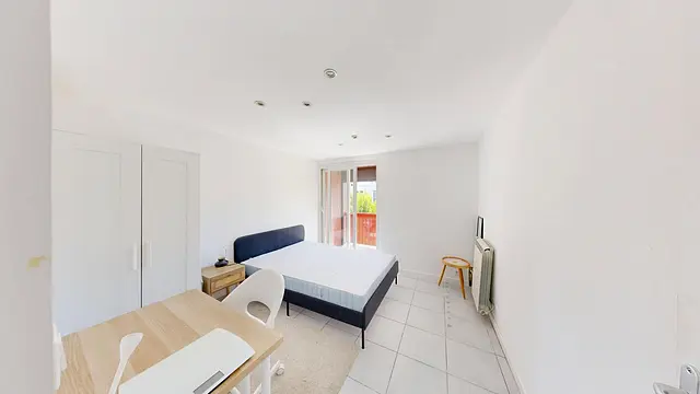 Cette chambre lumineuse et prête à vivre dispose d'un mobilier complet incluant un lit double, un bureau et un grand placard de rangement avec miroirs. Elle dispose d'un accès direct au balcon de la colocation.