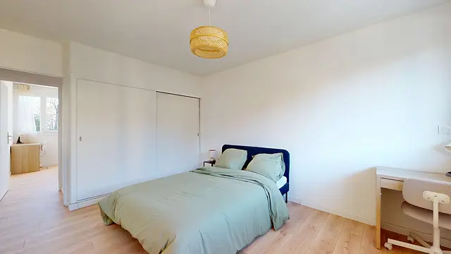 La chambre est dotée d’un lit double, d’un placard de rangement, d’un bureau avec chaise ainsi que d’un miroir.