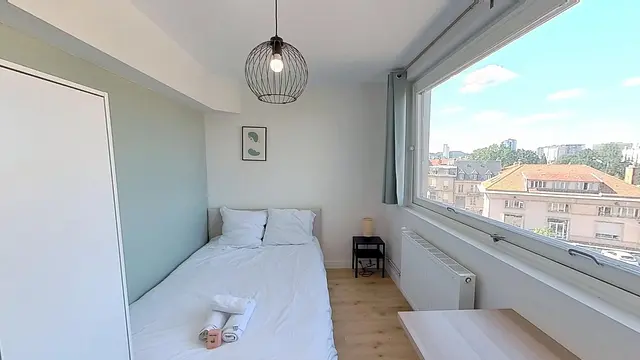 La chambre est lumineuse et bien agencée, avec une grande fenêtre offrant une belle vue dégagée. Elle est meublée avec un lit double, un bureau avec sa chaise et une lampe de travail, ainsi qu’une armoire de rangement. La décoration est sobre et moderne, idéale pour un cadre de vie calme et agréable. Tout est pensé pour que vous puissiez vous installer confortablement dès votre arrivée.